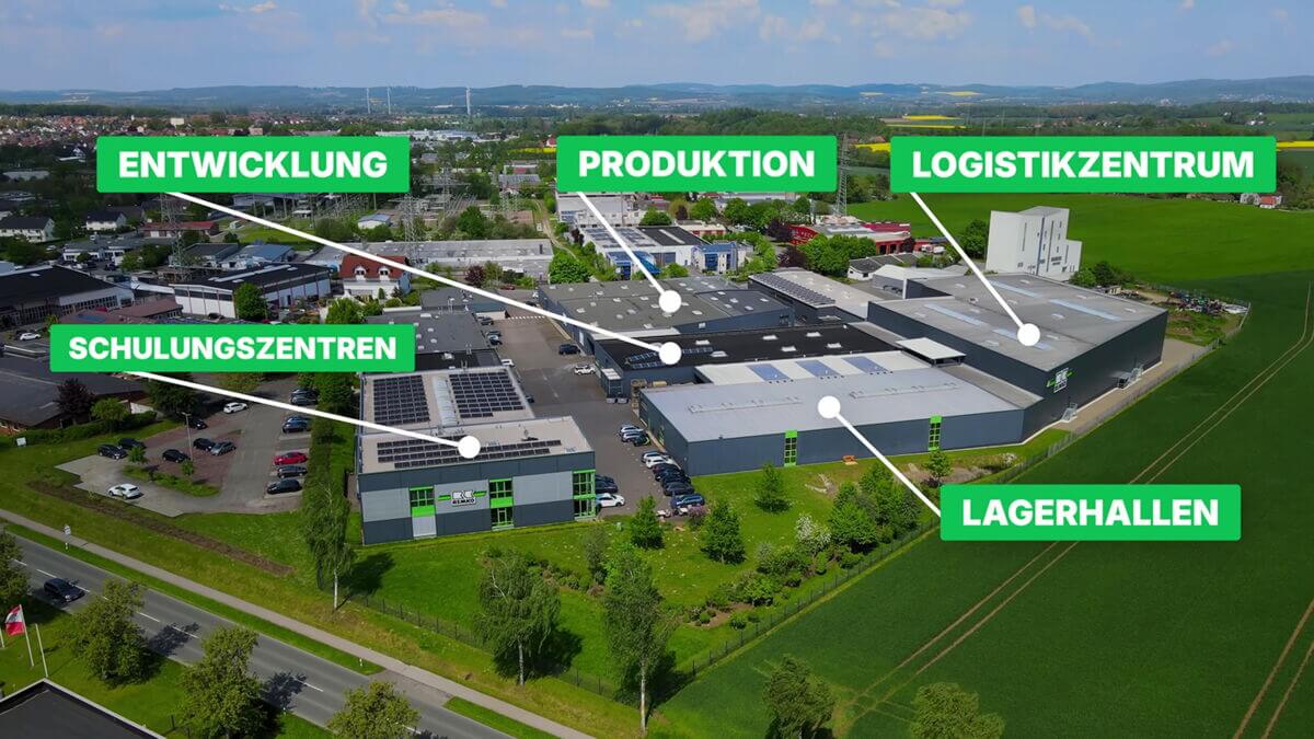 Zu sehen ist auch der heutige Standort in Lage, den die Firma wachstumsbedingt bereits 1983 bezog. Das Areal umfasst neben der Produktion die Abteilungen Entwicklung, Logistik und Lager, außerdem die beiden Schulungszentren. Mehr als 200 Mitarbeitende wirken hier an der Entstehung neuer Systeme mit – von der ersten Idee über Prototypen und Tests bis zur Serienreife.